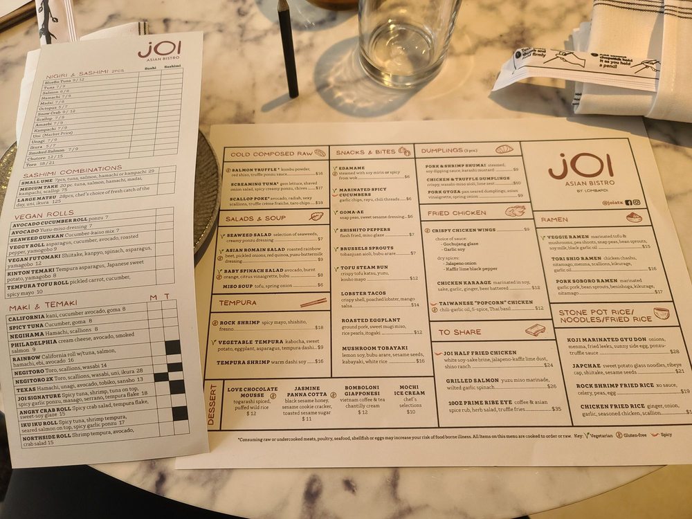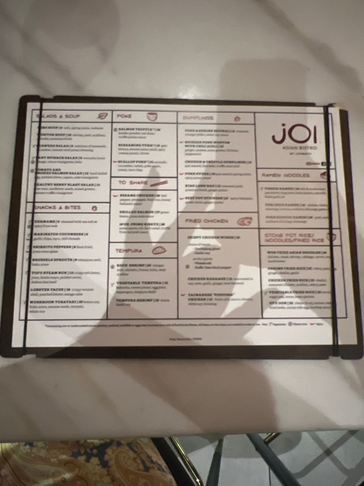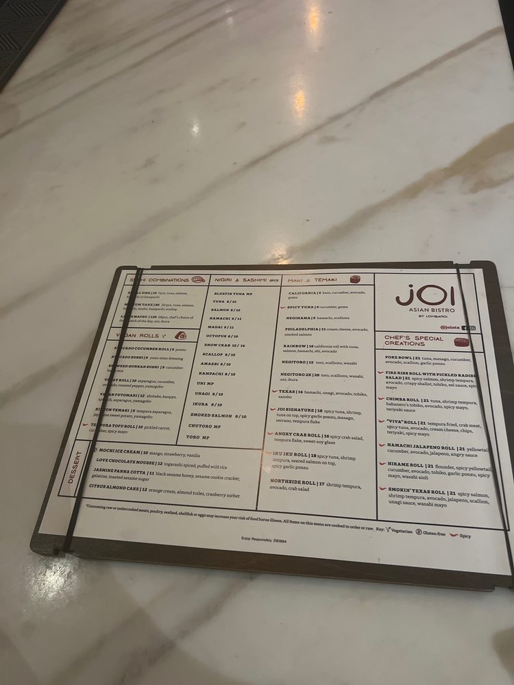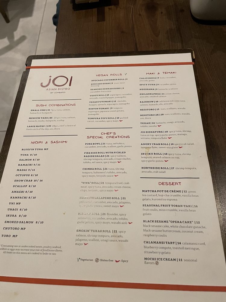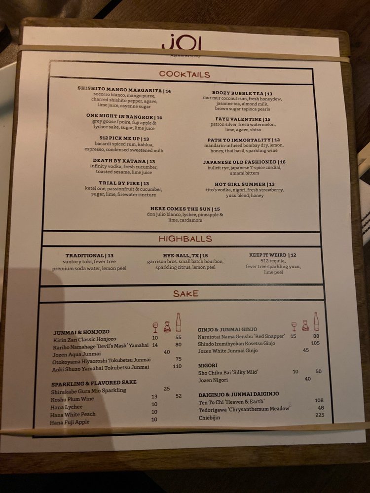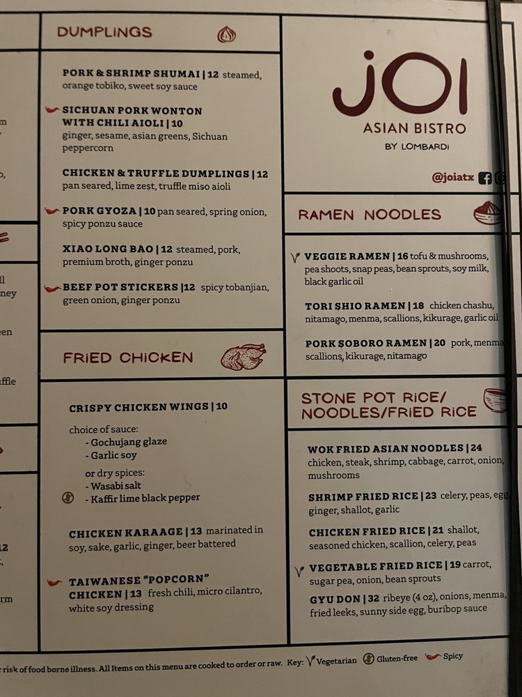 Introducing the menu at Joi, a trendy and intimate Asian fusion restaurant located in Austin's Domain area. Offering a variety of vegan and vegetarian options, Joi also provides outdoor seating and a full bar. Reviews highlight the flavorful ramen broth, unique sushi choices, and tasty appetizers like Viva Rolls and Pork Gyoza. The modern decor creates a cool ambiance, perfect for a casual dinner or dessert. Service is friendly and attentive, making it a great spot for groups to enjoy a shared dining experience. Don't miss out on the Shishito Mango Margaritas for a refreshing twist. Joi's menu is sure to delight with its creative dishes and quick service. Visit Joi for a memorable dining experience in Austin.