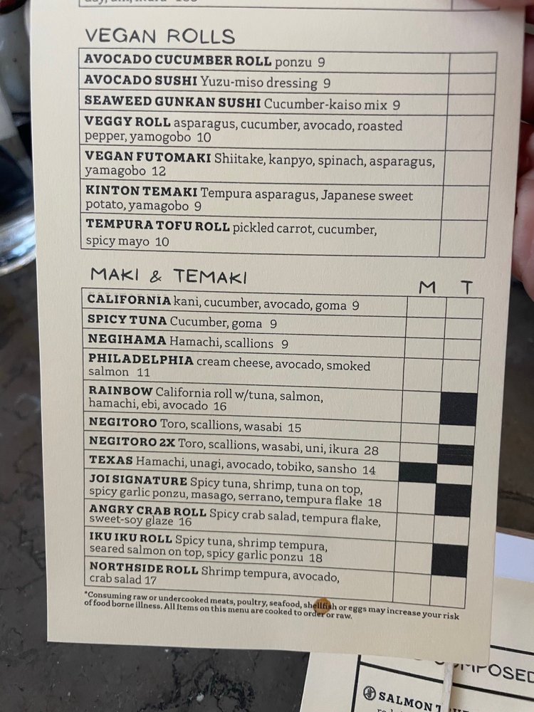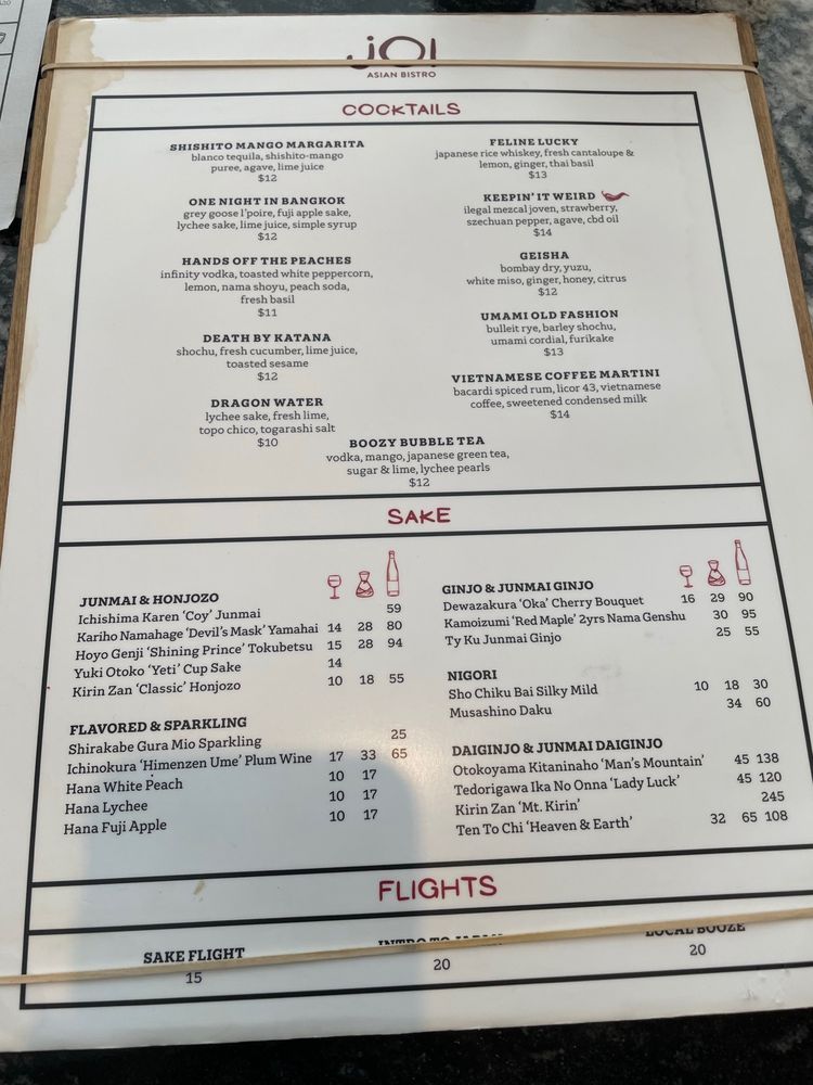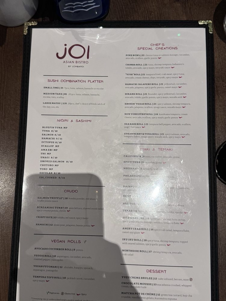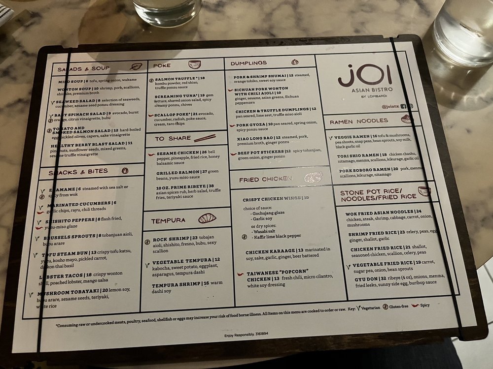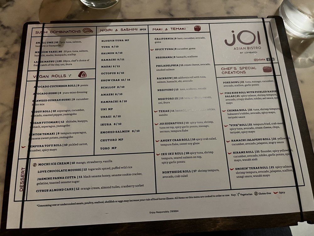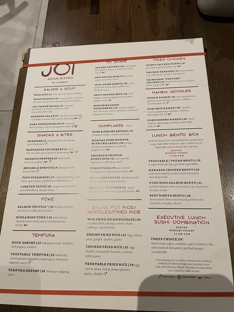 Introducing the menu at Joi, a trendy and intimate Asian fusion restaurant located in Austin's Domain area. Offering a variety of vegan and vegetarian options, Joi also provides outdoor seating and a full bar. Reviews highlight the flavorful ramen broth, unique sushi choices, and tasty appetizers like Viva Rolls and Pork Gyoza. The modern decor creates a cool ambiance, perfect for a casual dinner or dessert. Service is friendly and attentive, making it a great spot for groups to enjoy a shared dining experience. Don't miss out on the Shishito Mango Margaritas for a refreshing twist. Joi's menu is sure to delight with its creative dishes and quick service. Visit Joi for a memorable dining experience in Austin.